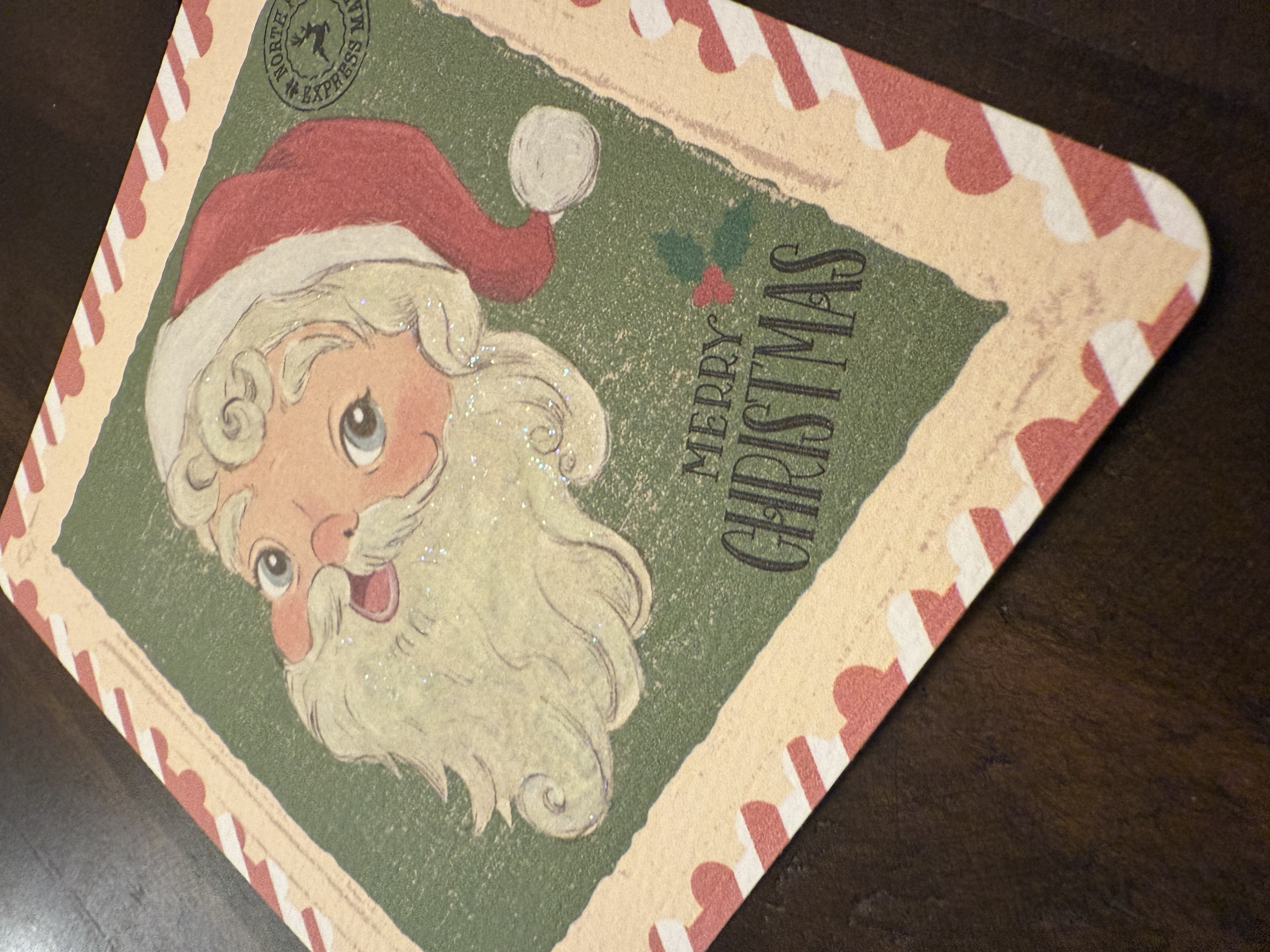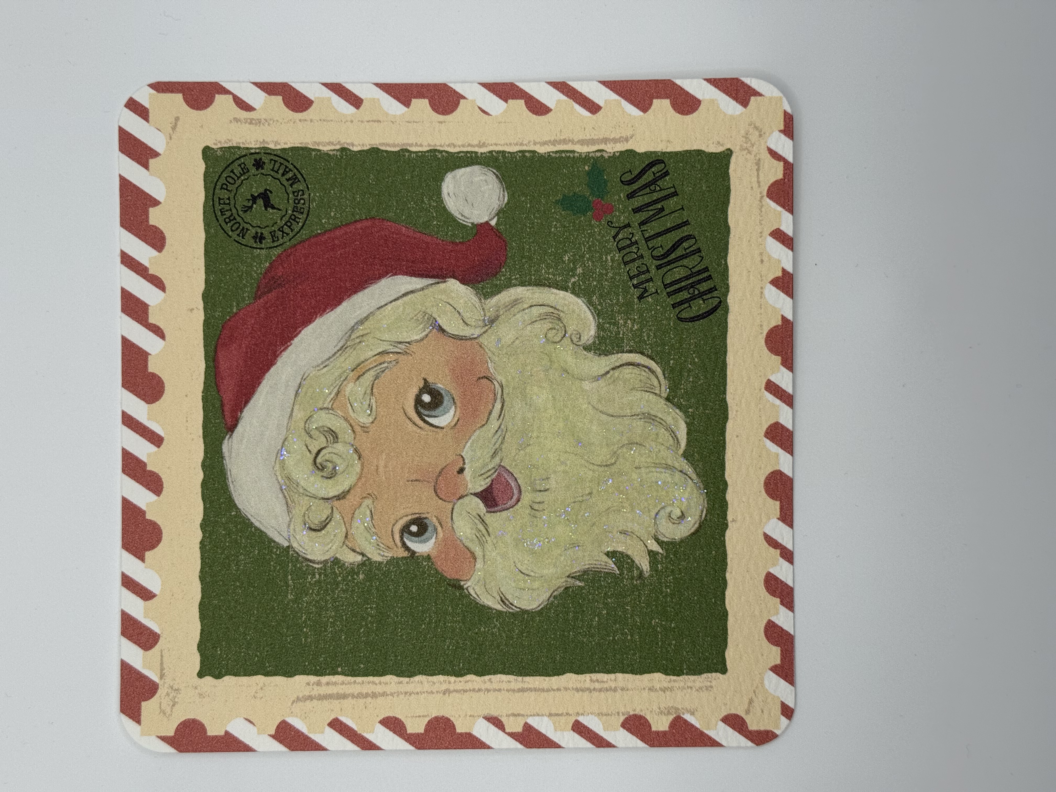 This 5x5 Christmas card is designed to look like a vintage stamp. Jolly Santa adorns this greeting card. The colors are a little “off” on purpose to mimic age of this “stamp”. This card will come with either random Red or Green 5x5 envelope of our choosing.