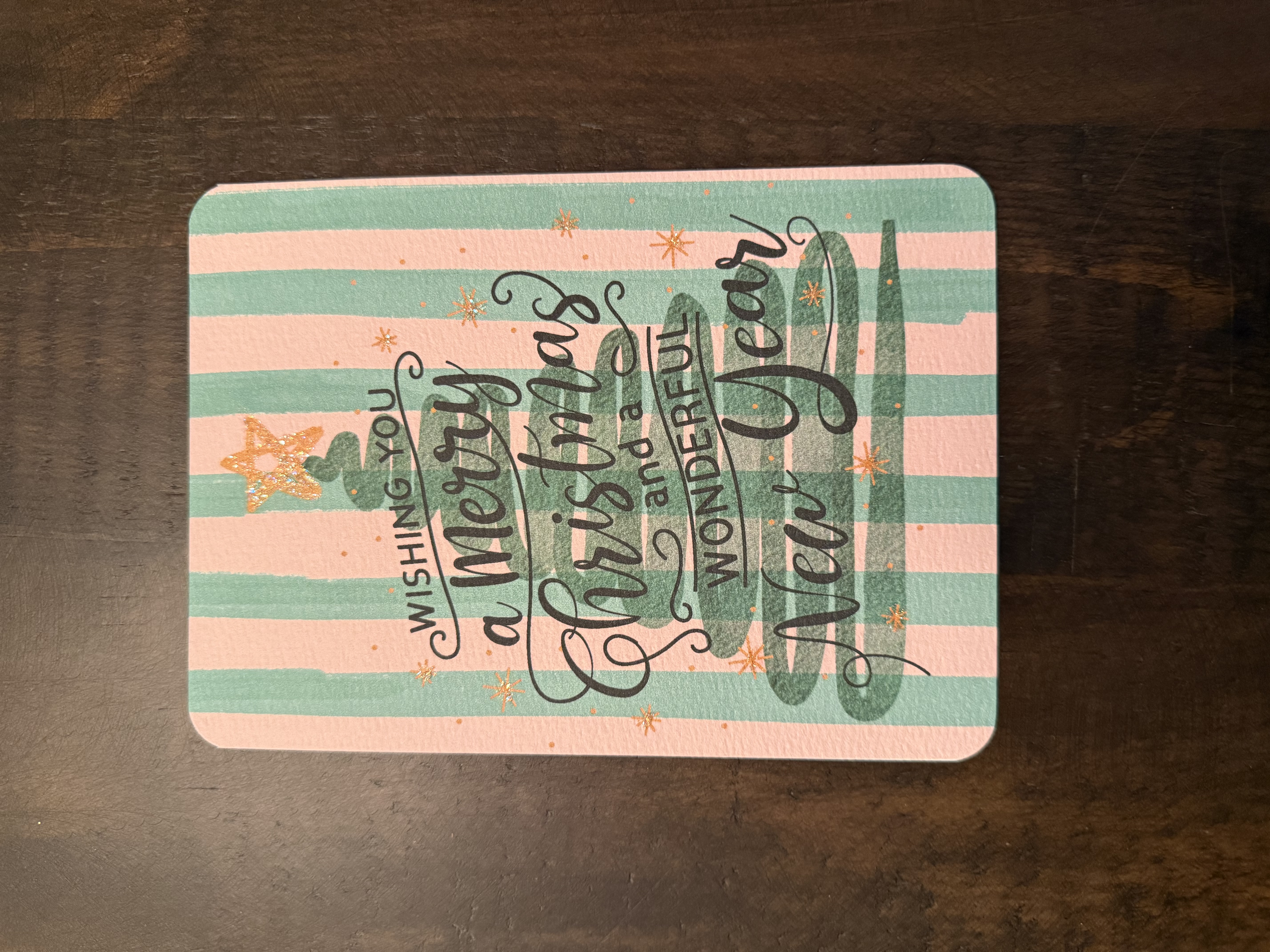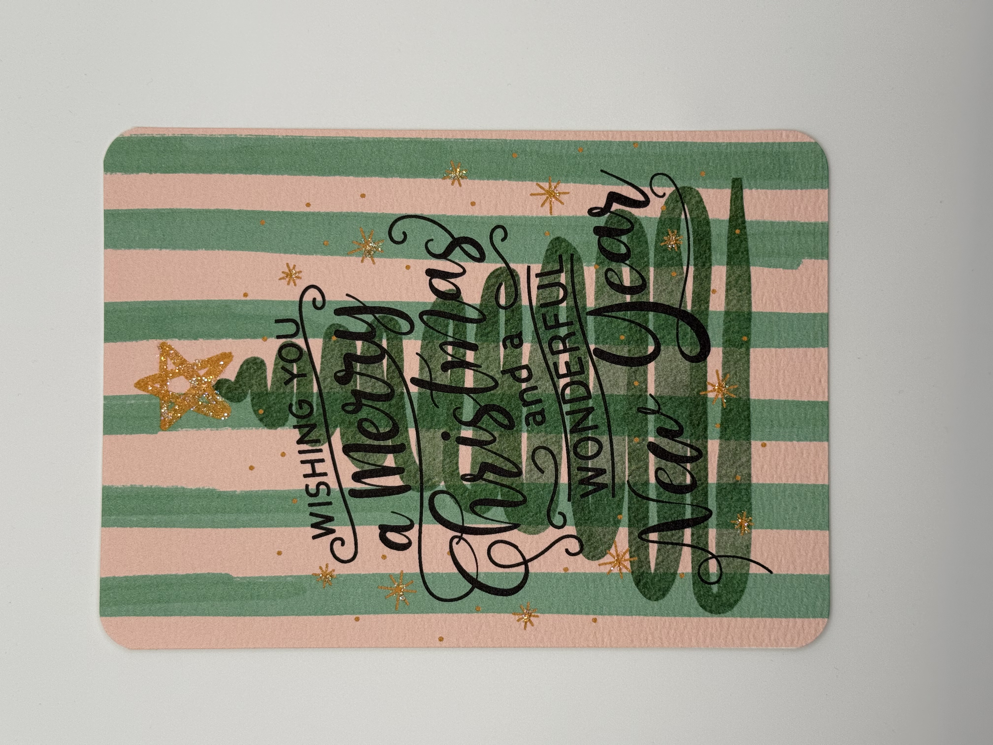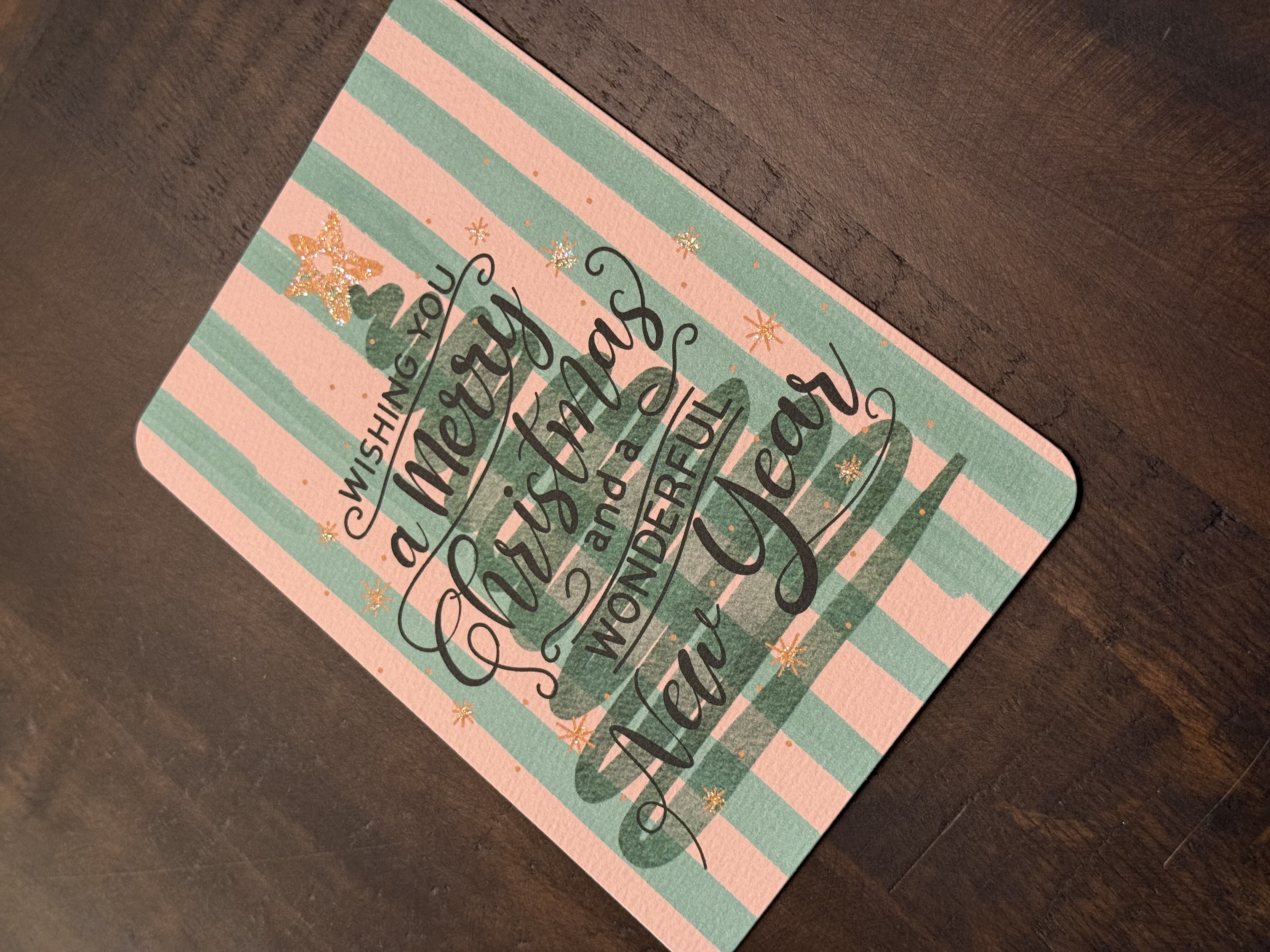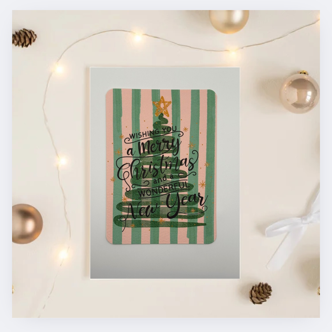 This design is a modern take on the classic Christmas tree. Pink and green stripes adorn the background adding interest to this design.