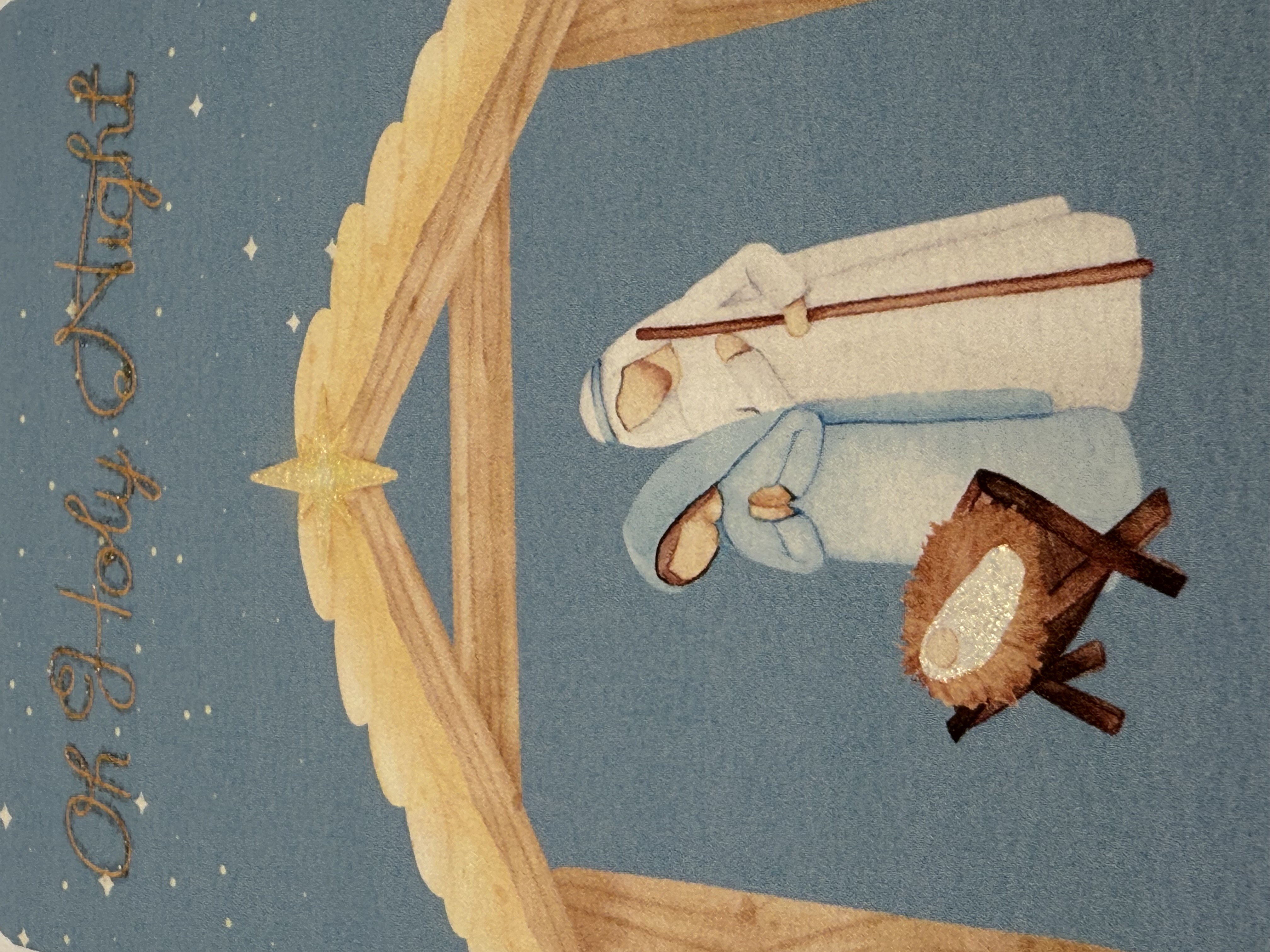 Reason for the season. O Holy Night design features baby Jesus in the manger with Mary and Joseph.