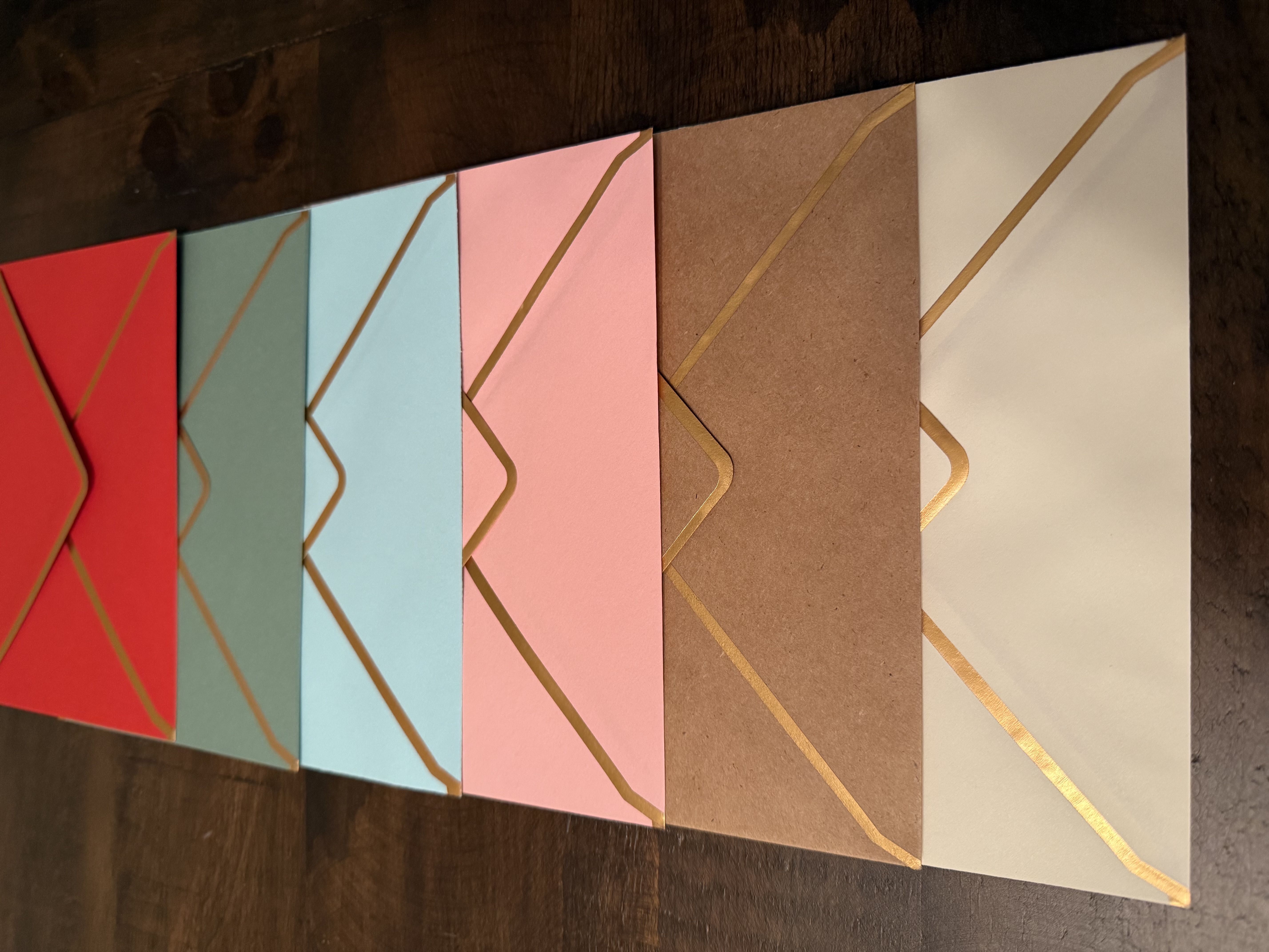 Our designs are created digitally beginning from a blank page by using graphic designs (never AI images), printed on 100% cotton watercolor paper, then accents are hand painted with watercolor and acrylic paints to bring the images to life offering a multi dimensional effect. Images are printed on the front side of card, leaving the back side of the card blank for your own personal message. Our company logo will be on the back of the card. Every 5x7 card will include a complementary gold trimmed envelope. Color of envelope may vary in color based on availability/season/or holiday. Envelope color will be picked by us.